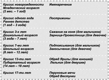 Наши предки тонко чувствовали человеческую душу, все изменения, происходящие с ней на разных возрастных этапах. И мудрость древних обрядов подтверждается в нынешнее время исследованиями современных психологов. Так можно проследить соответствие между переходными возрастами, выделенными Л.С. Выготским, и возрастными посвящениями наших предков. (см. таблицу).